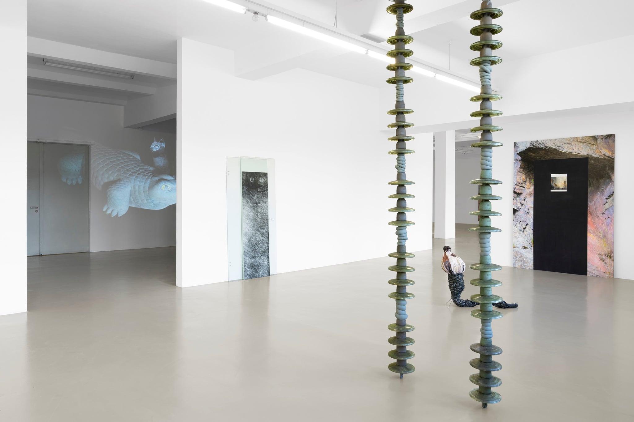 All Together now, video, 7', 2021 ohne Titel V, 185 cm x 72 cm, silver gelatin photogram between glas doors, 2020 Five pictures of cave paintings pasted onto five paintings of caves (homage to Jonathan Monk), 235 cm x 165 cm, c-prints, gouache and offset prints on cardboard, 2022 Photography: Franziska von den Driesch